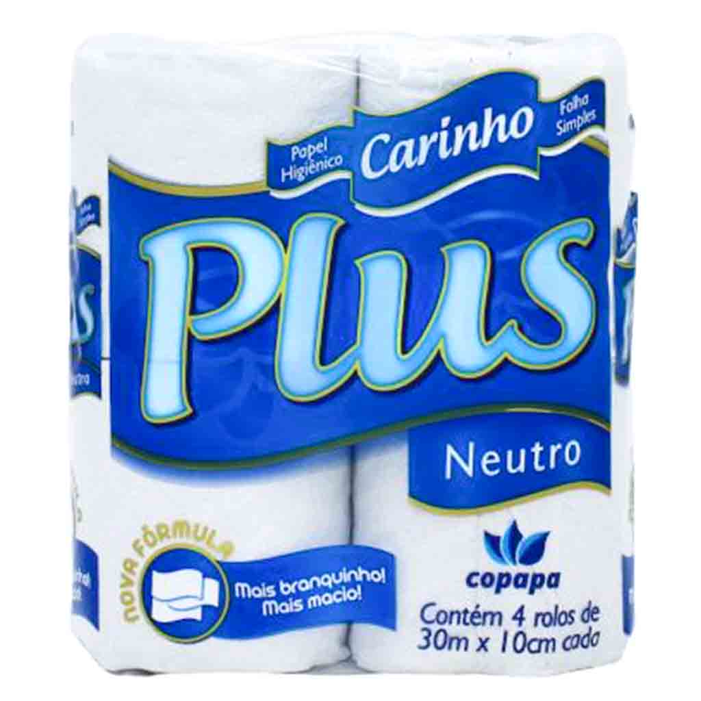 O papel higiênico folha simples da marca Carinho Plus é um produto de alta qualidade e ideal para uso doméstico. Cada pacote contém 4 rolos de papel higiênico.